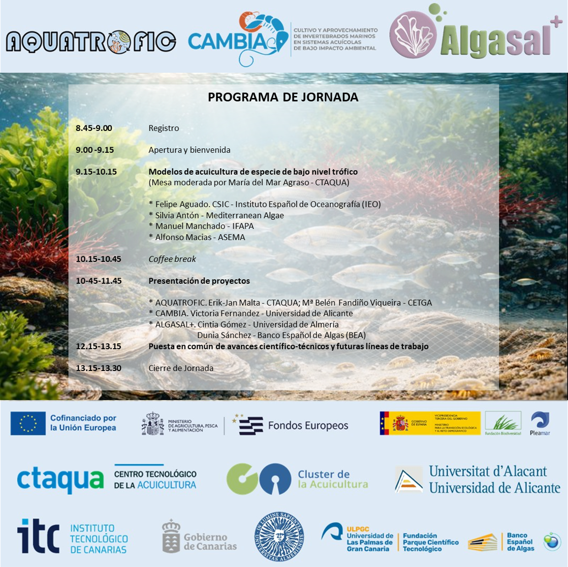 04 diciembre 2025 - El próximo 15 de enero de 2026, CTAQUA reunirá a entidades del sector, centros de investigación y público general en una jornada final de difusión de resultados de tres proyectos del ámbito de la economía azul: AQUATROFIC, CAMBIA y ALGASAL⁺. Estas iniciativas comparten un objetivo común centrado en promover especies de bajo nivel trófico, mejorar la sostenibilidad de los sistemas de producción y aplicar soluciones innovadoras que refuercen la eficiencia y la circularidad en la acuicultura. (Inscripciones disponibles).