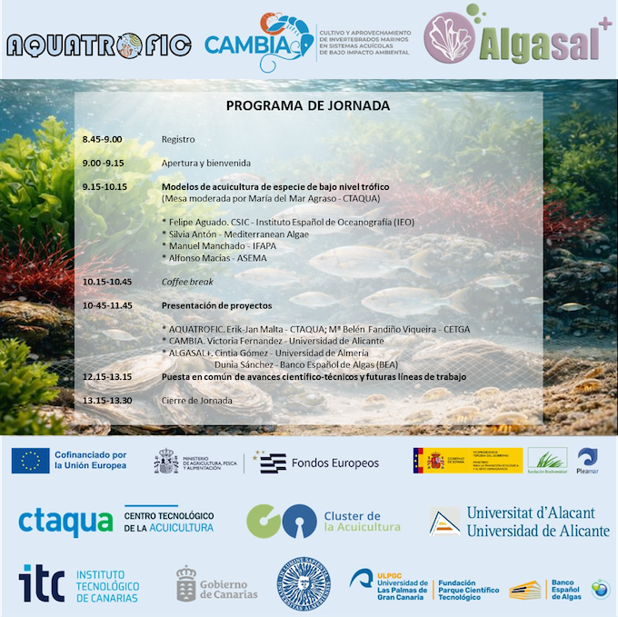 La jornada se celebrará en el edificio de CTAQUA, en El Puerto de Santa María, y contará con un programa diseñado para fomentar el intercambio de conocimiento. Tras la bienvenida institucional, se celebrará una mesa redonda inicial dedicada a los puntos en común entre los tres proyectos, las líneas de investigación que comparten y las ventajas de enfoques como el IMTA, con la participación de especialistas invitados del sector.